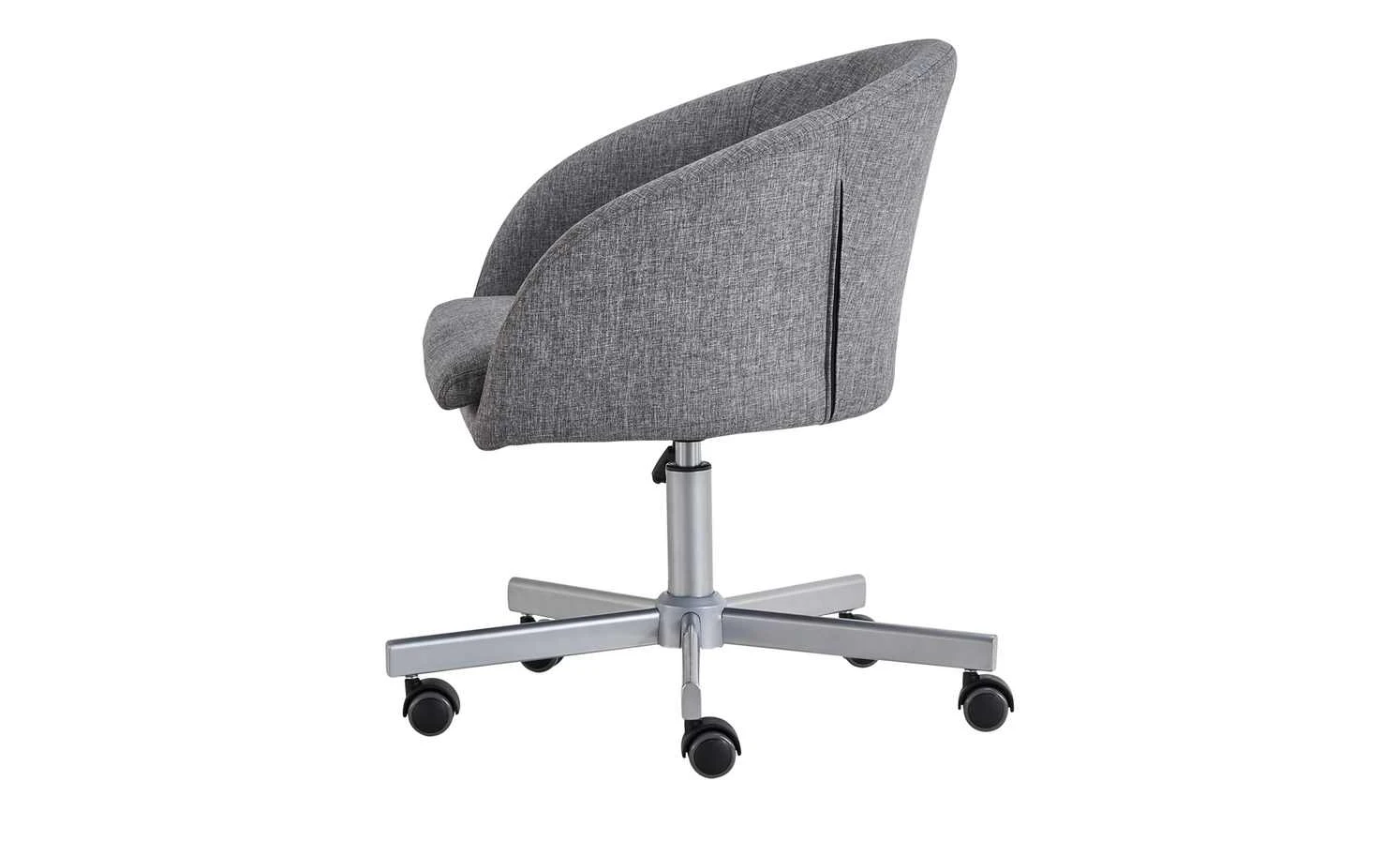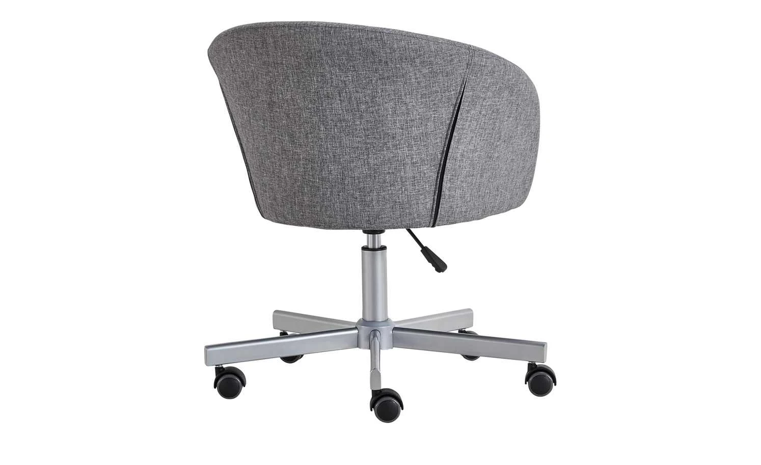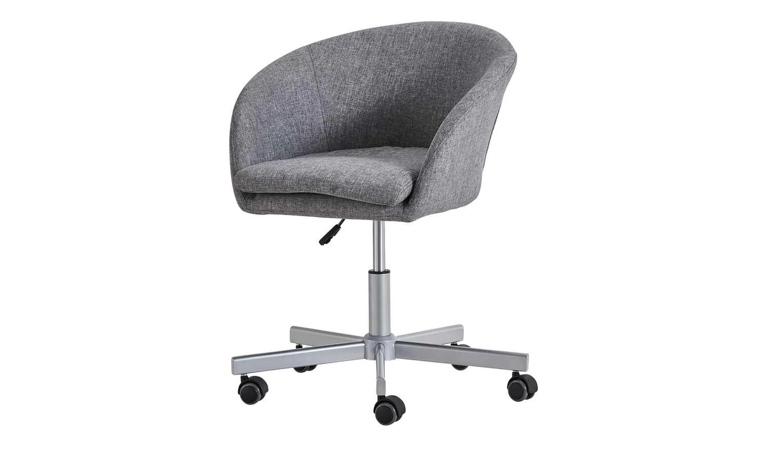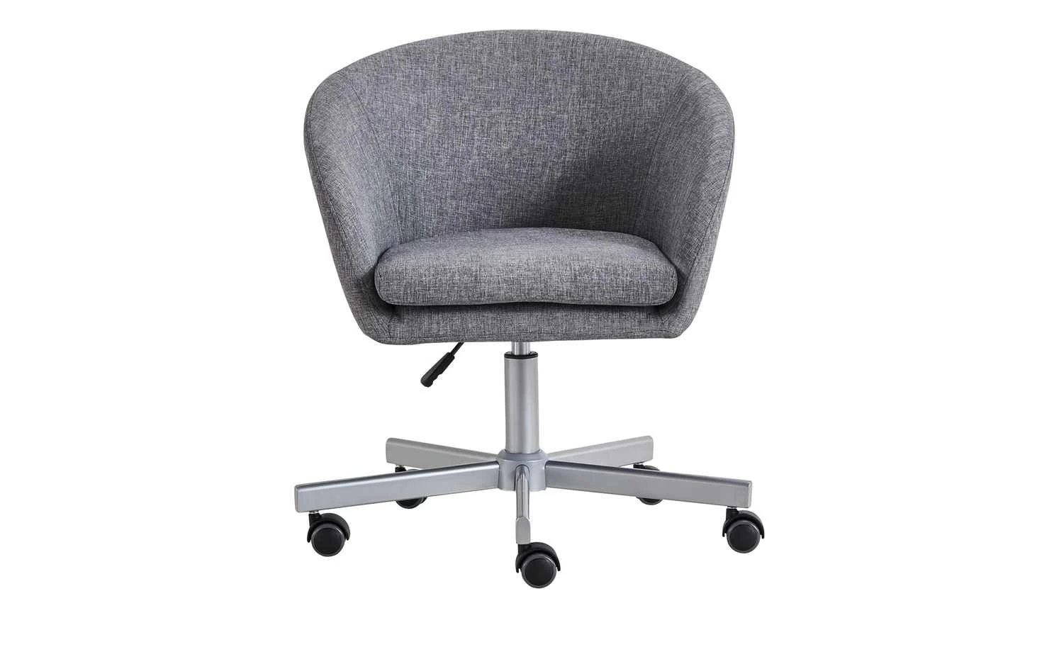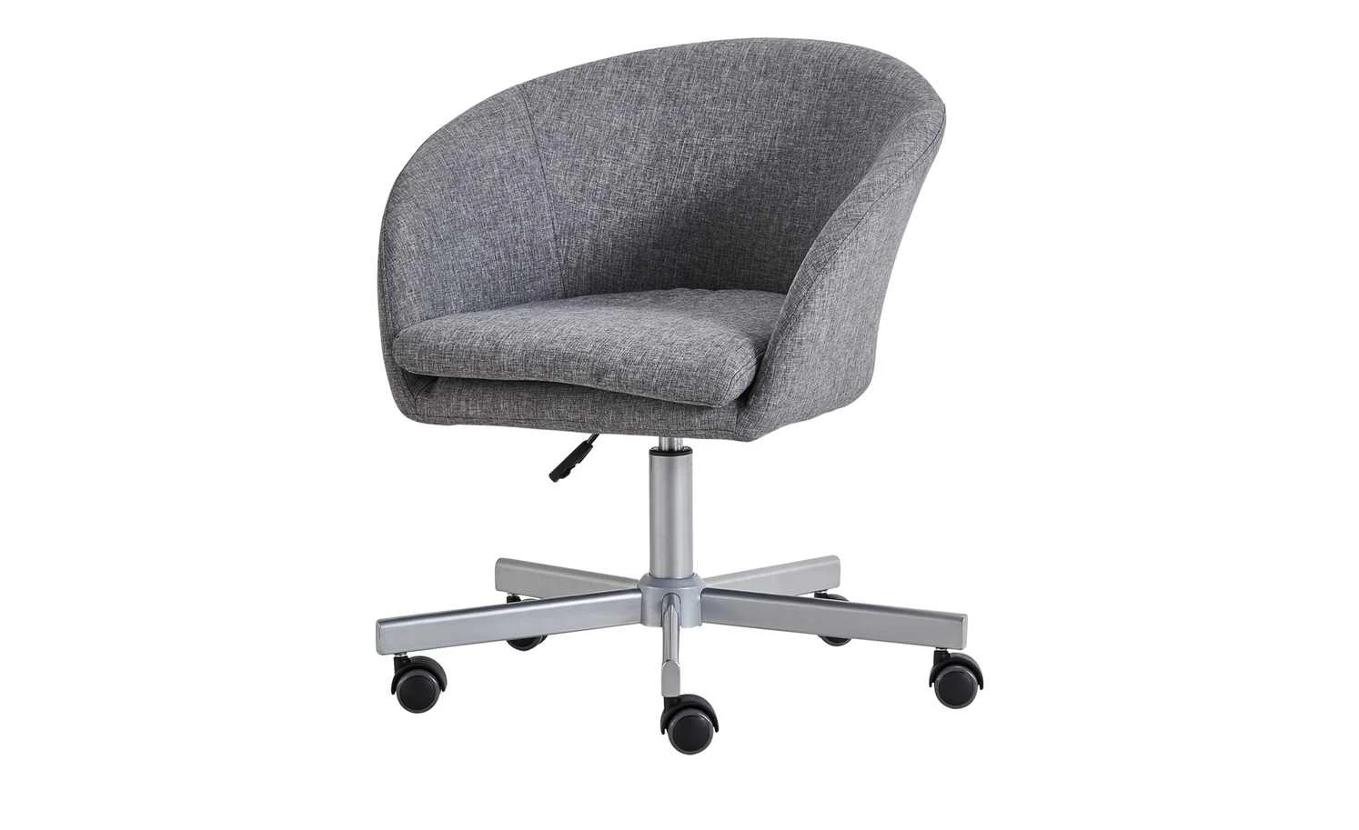Modern designt und gemütlich – das ist der Bürodrehstuhl Bära 2. Die Sitzschale erinnert in ihrer Form ein wenig an einen Cocktailsessel. Und sie ist auch genauso bequem. Dafür sorgt die dicke Schaumstoffpolsterung unter dem melierten grauen Bezug. Sie können die Sitzhöhe von 42 bis 52 Zentimeter verstellen. Möglich macht das der kleine Hebel unterhalb der Sitzschale. Soll Bära 2 Rollen oder Gleiter haben? Das können Sie individuell bei der Montage entscheiden. Beides ist im Lieferumfang enthalten.