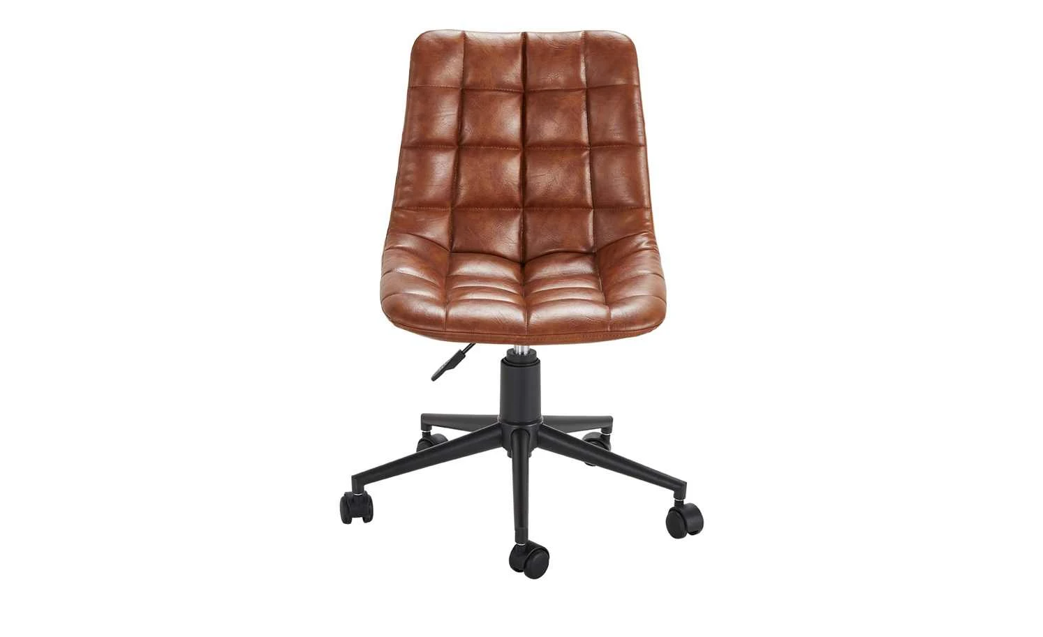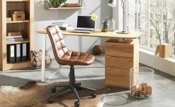 Für den heimischen Schreibtisch braucht es auch einen passenden Stuhl. So wie den Bürodrehstuhl Anglin. Die gesamte Sitzschale ist weich gepolstert und mit braunem Kunstleder bezogen. Die gesamte Vorderseite ist quadratisch gesteppt. Dank des kleinen Hebels unter der Sitzfläche können Sie den Drehstuhl in der Höhe verstellen. Das ist von 42 bis 50 Zentimeter möglich.
