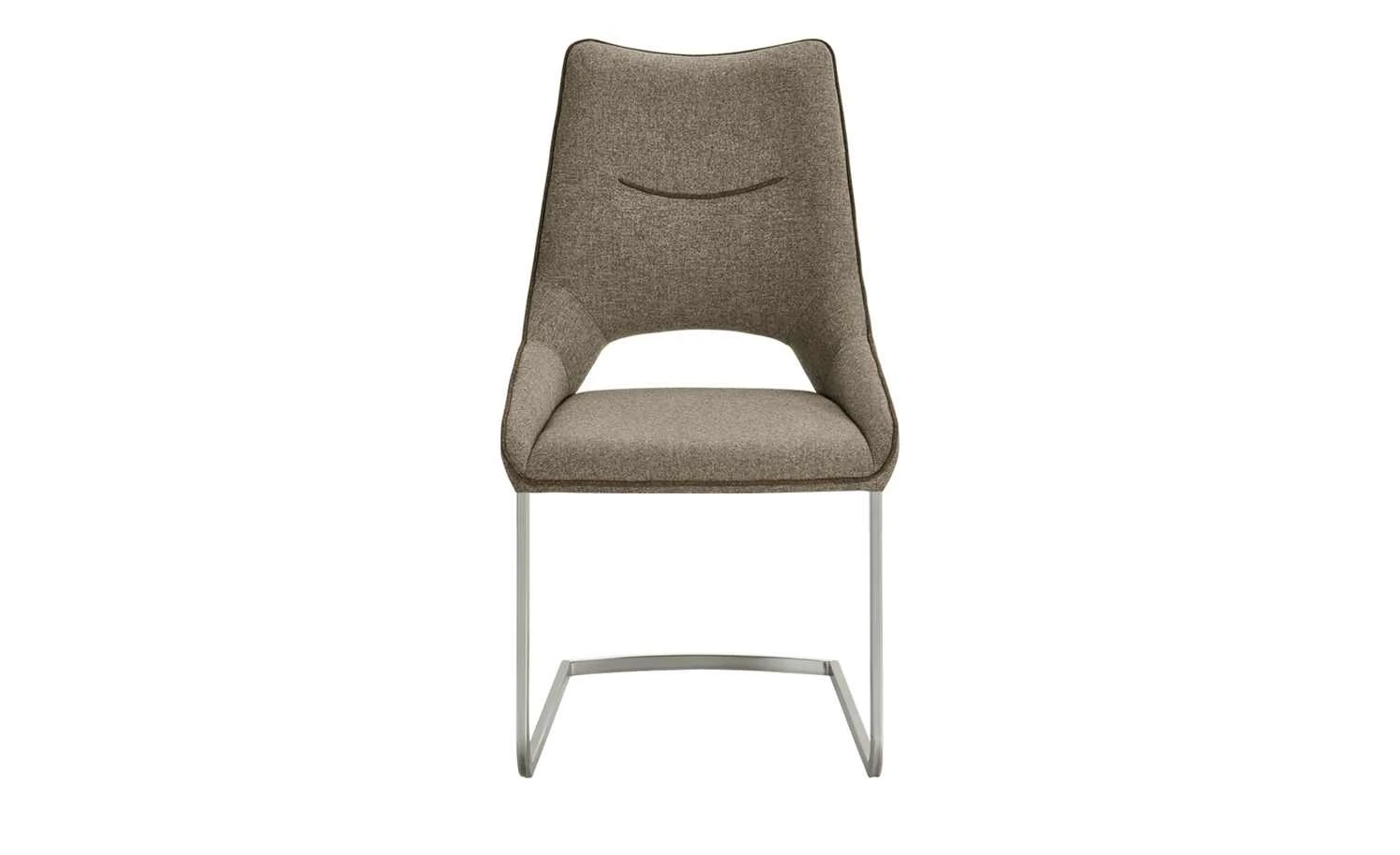 Der Schwingstuhl Lenira bringt ein junges, modernes Design an den Esstisch. Die hohe Rückenlehne ist im unteren Bereich offen designt – und geht seitlich in den Sitzbereich über. Eine dekorative Quernaht befindet sich an Vorder- und Rückseite der Lehne. Ihre geschwungen Optik greift den schwungvollen Look des oberen Lehnenrandes auf. Der ganze Sitz- und Rückenbereich wird zudem von einem Keder umrandet. Er setzt sich dezent vom melierten Webstoffbezug ab. Lenira ist weich gepoltert, damit Sie es beim Essen richtig bequem haben.