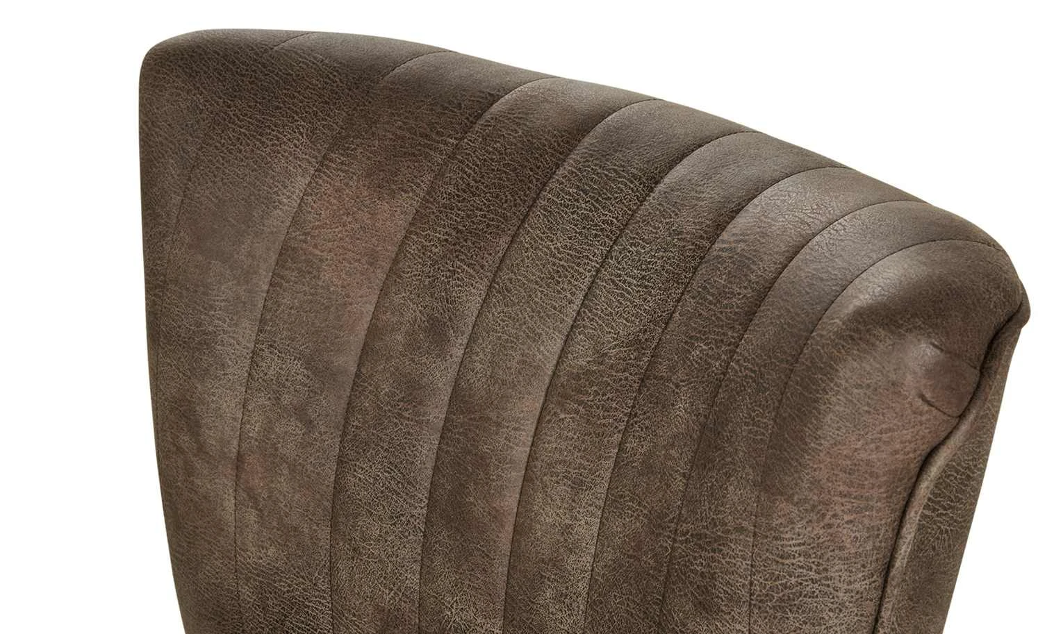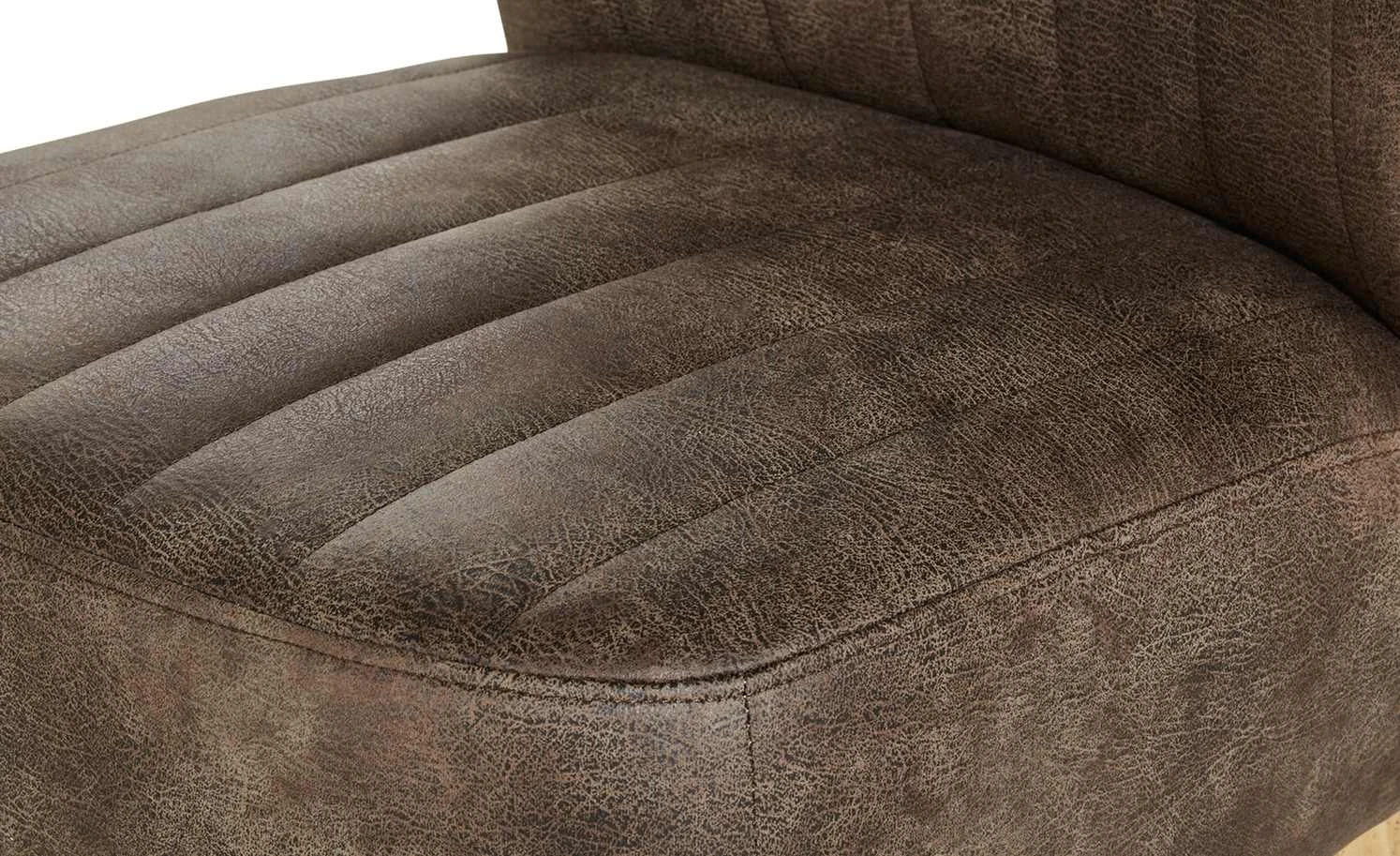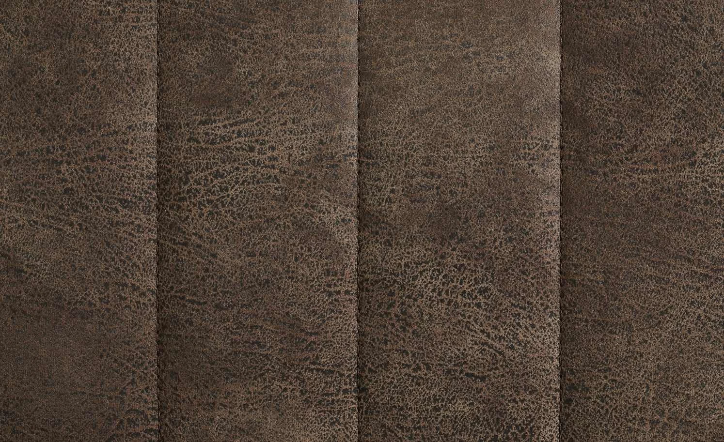 Einen coolen Vintage-Look hat der Polsterstuhl Bruce. Er ist mit braunem Kunstleder bezogen. Dieses ist alt und abgenutzt aus. Sitz und Rücken sind mit Längsnähten abgesteppt. Dank der Nosagfederung im Sitz sitzen Sie bequem.