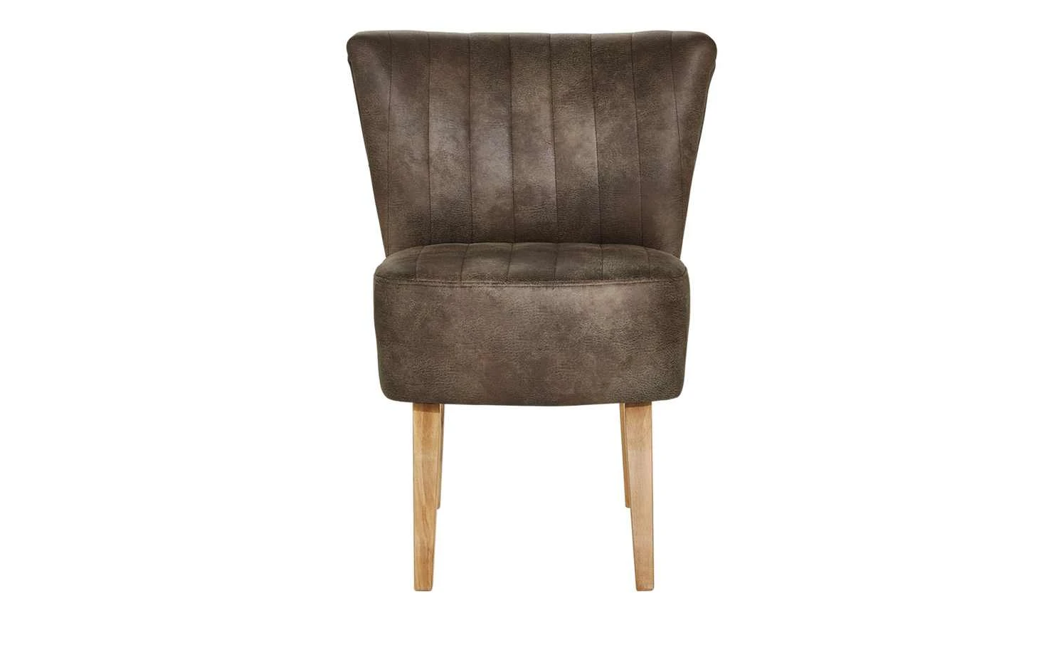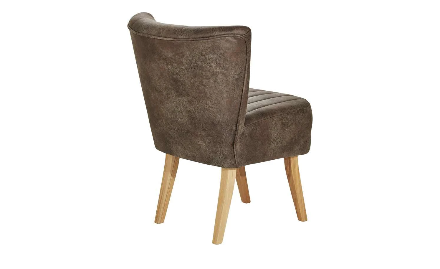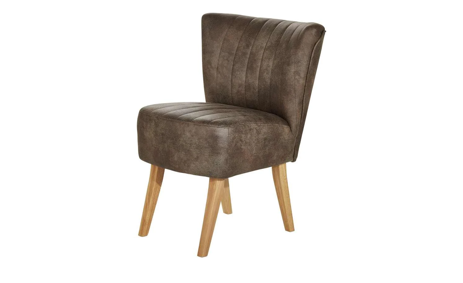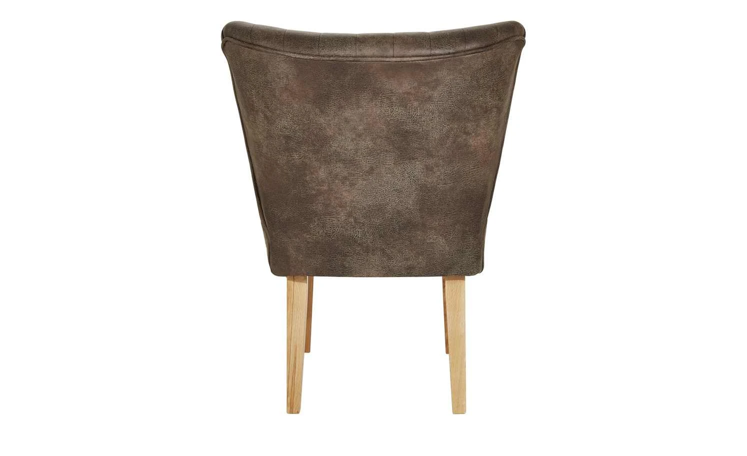 Einen coolen Vintage-Look hat der Polsterstuhl Bruce. Er ist mit braunem Kunstleder bezogen. Dieses ist alt und abgenutzt aus. Sitz und Rücken sind mit Längsnähten abgesteppt. Dank der Nosagfederung im Sitz sitzen Sie bequem.