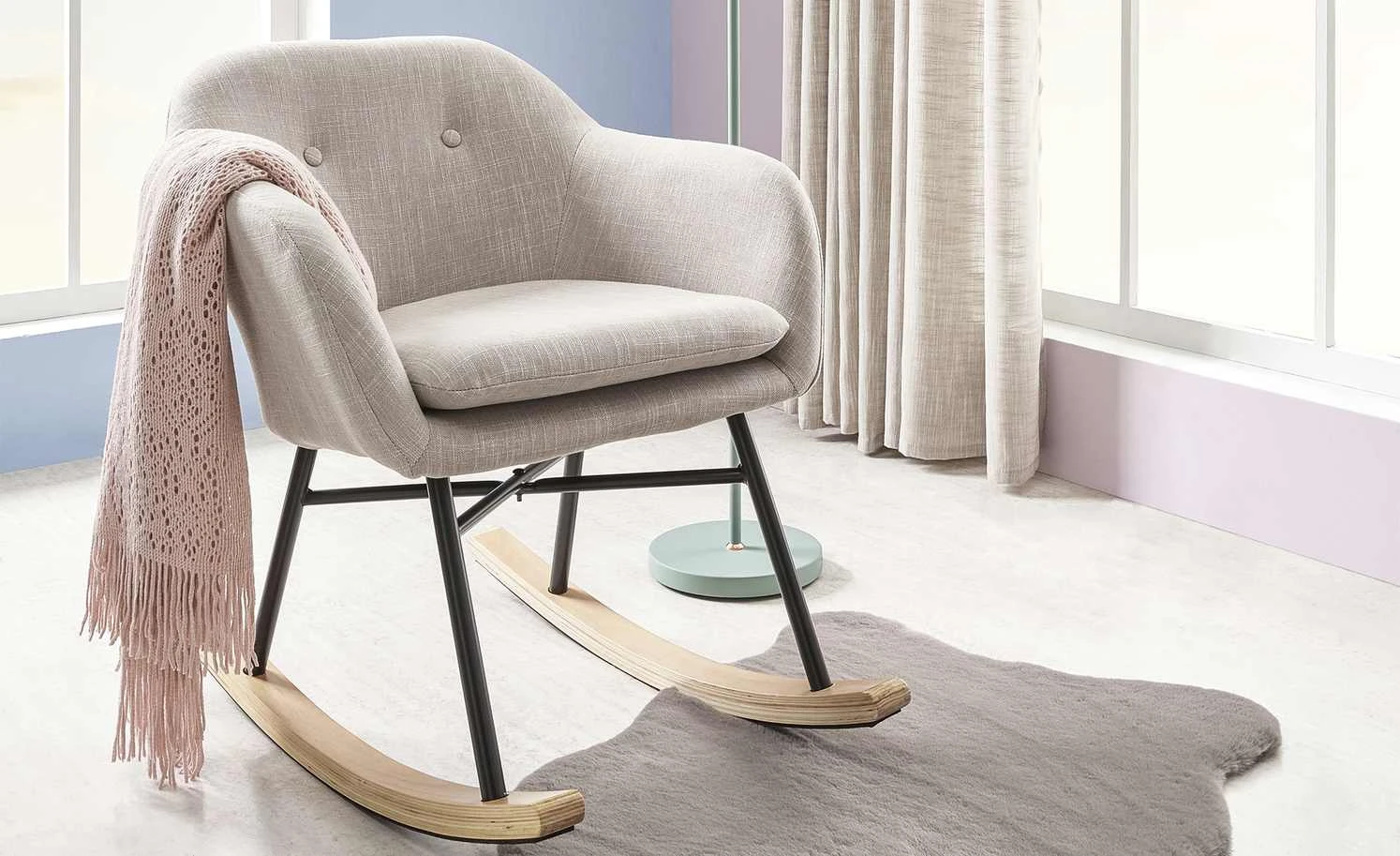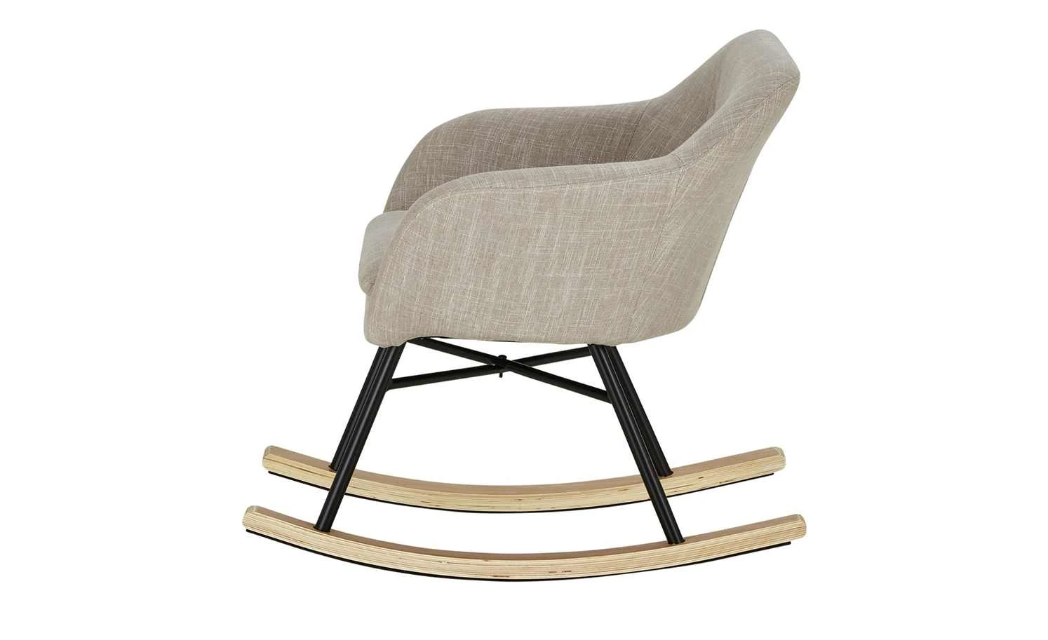 Bequem Sitzen und beim Schaukeln entspannen – das können Sie mit dem Schaukelsessel Rocco. Die Sitzschale ist weich gepolstert und zusätzlich mit einem weichen Sitzkissen ausgestattet. Rückenlehne und beide Armlehnen haben eine angenehme, bequeme Höhe. Für den Bezug ist ein dekorativer grau melierter Webstoff verwendet worden. Das Gestell besteht aus stabilem Metall und hat einen matten schwarzen Farbton. Beide Kufen sind mit Birkenholz furniert und haben Filzgleiter auf der Unterseite. Sie sollen den Boden vor Abnutzungen schützen.